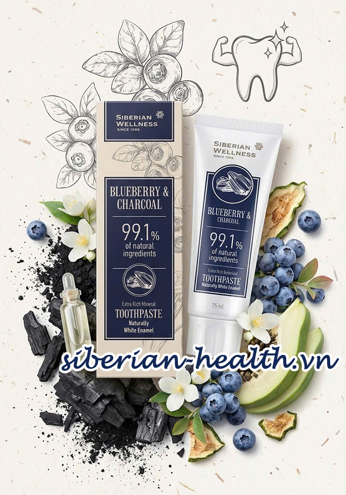 Kem Siberian Việt Quất: Trắng sáng dựa trên cơ chế hấp phụ của than và bảo vệ của thảo mộc. Dùng lâu dài chỉ thấy răng chắc khỏe, sáng bóng tự nhiên chứ không hề có chuyện tê tái.